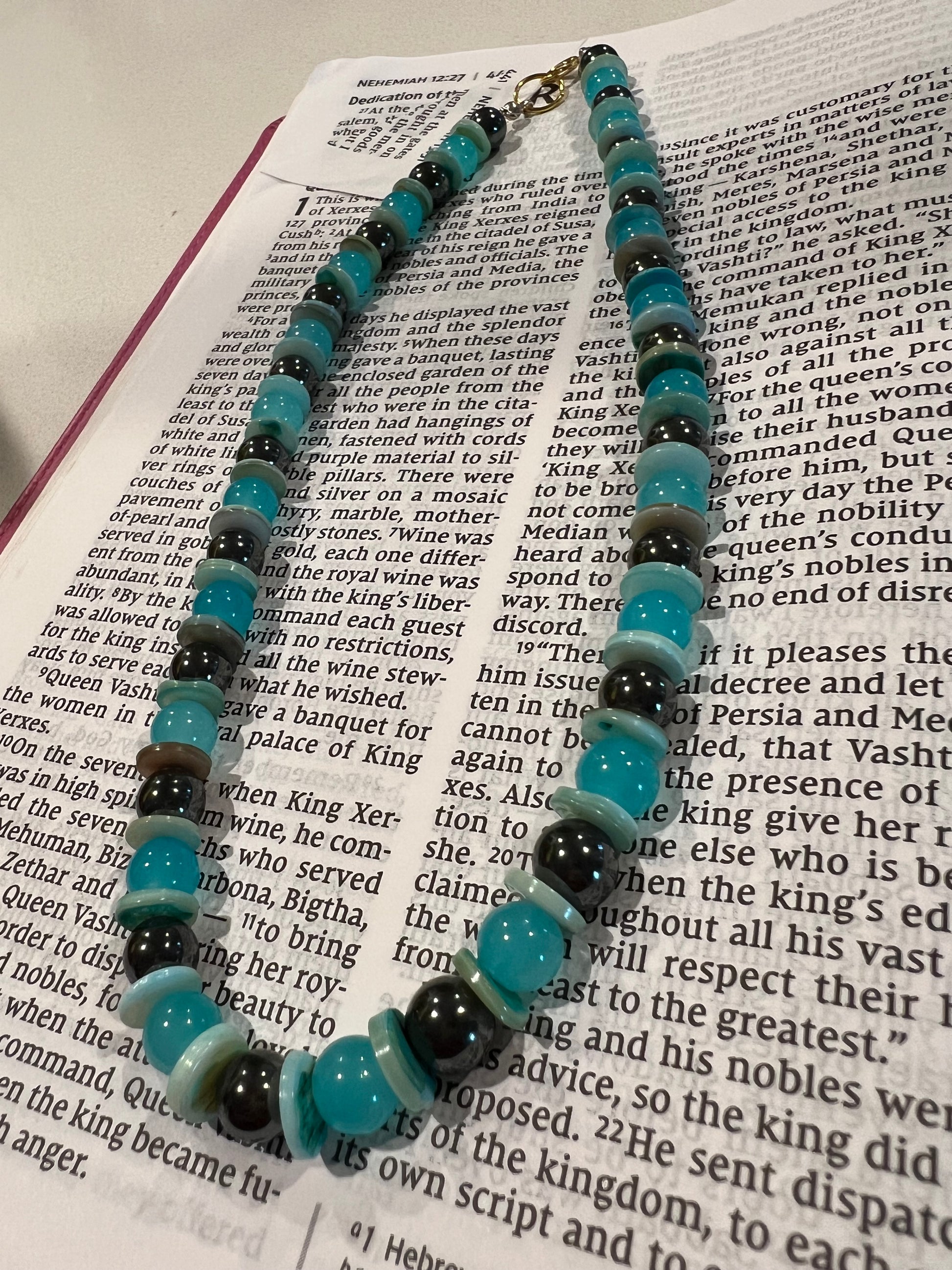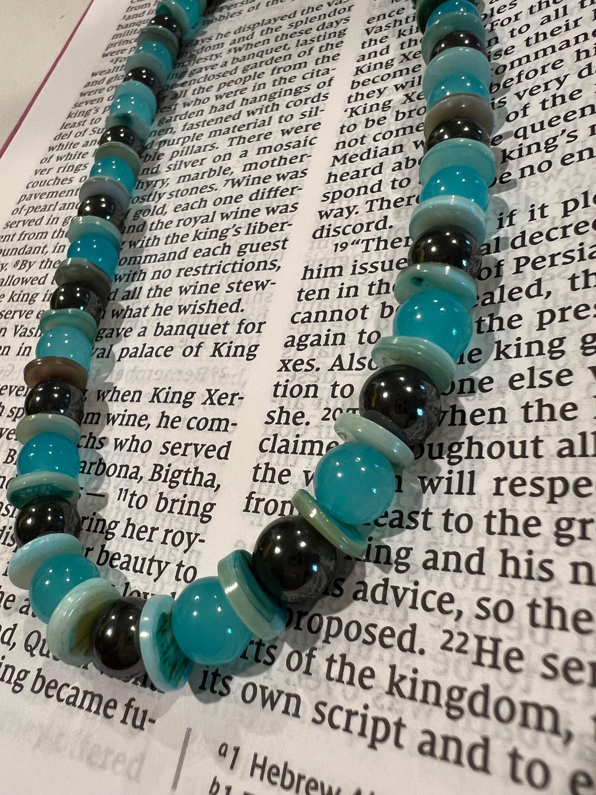 Graceful shades of aqua and gray blend like sea and sky a reminder that Godβs promises never fade. Every bead tells a story of balance, hope, and heavenly peace. Perfect for a heart that finds beauty in stillness and faith in every season.