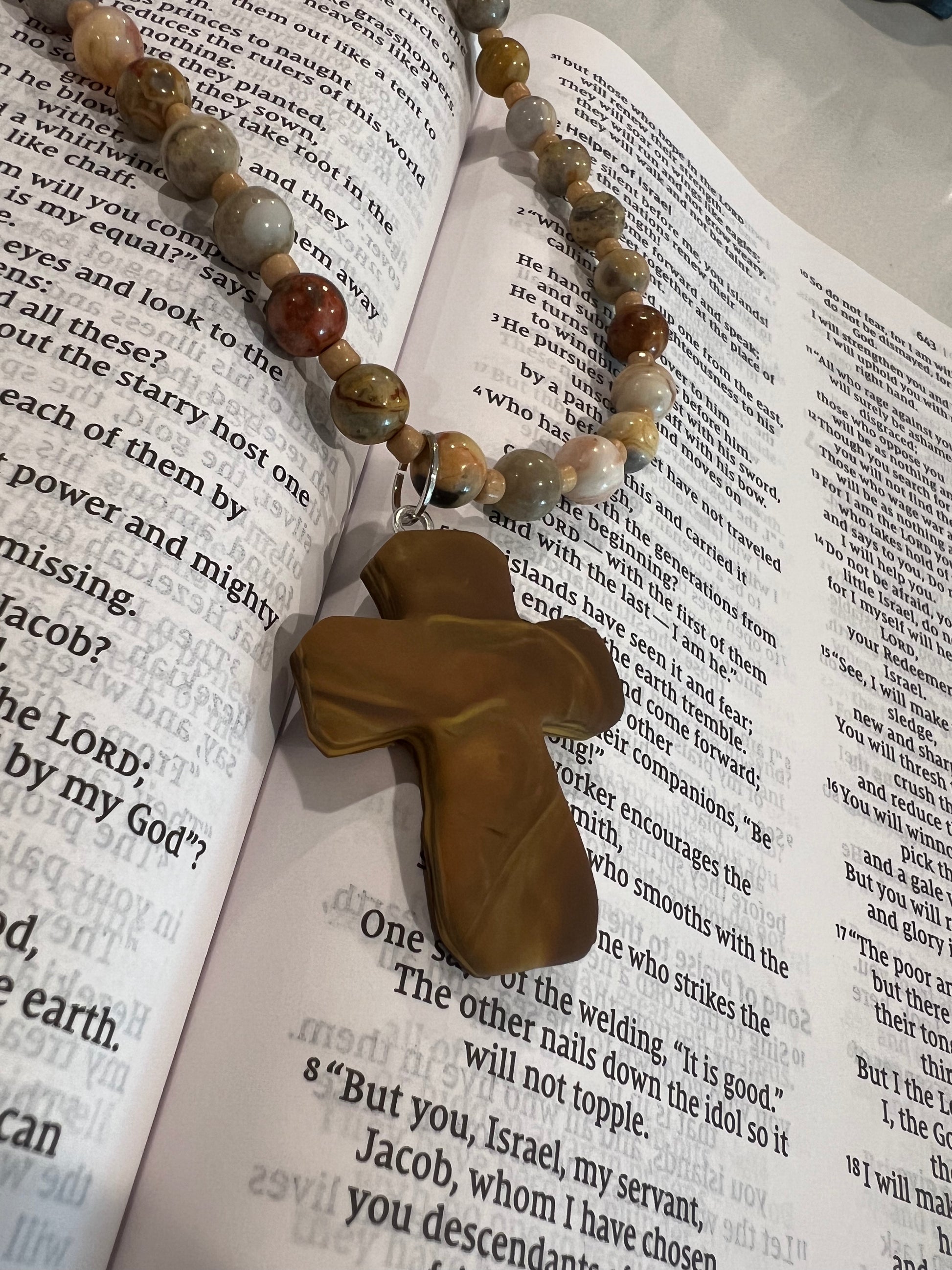 Handmade with fall-toned stones and handmade clay cross, a gentle reminder of God's artistry in every season.