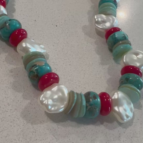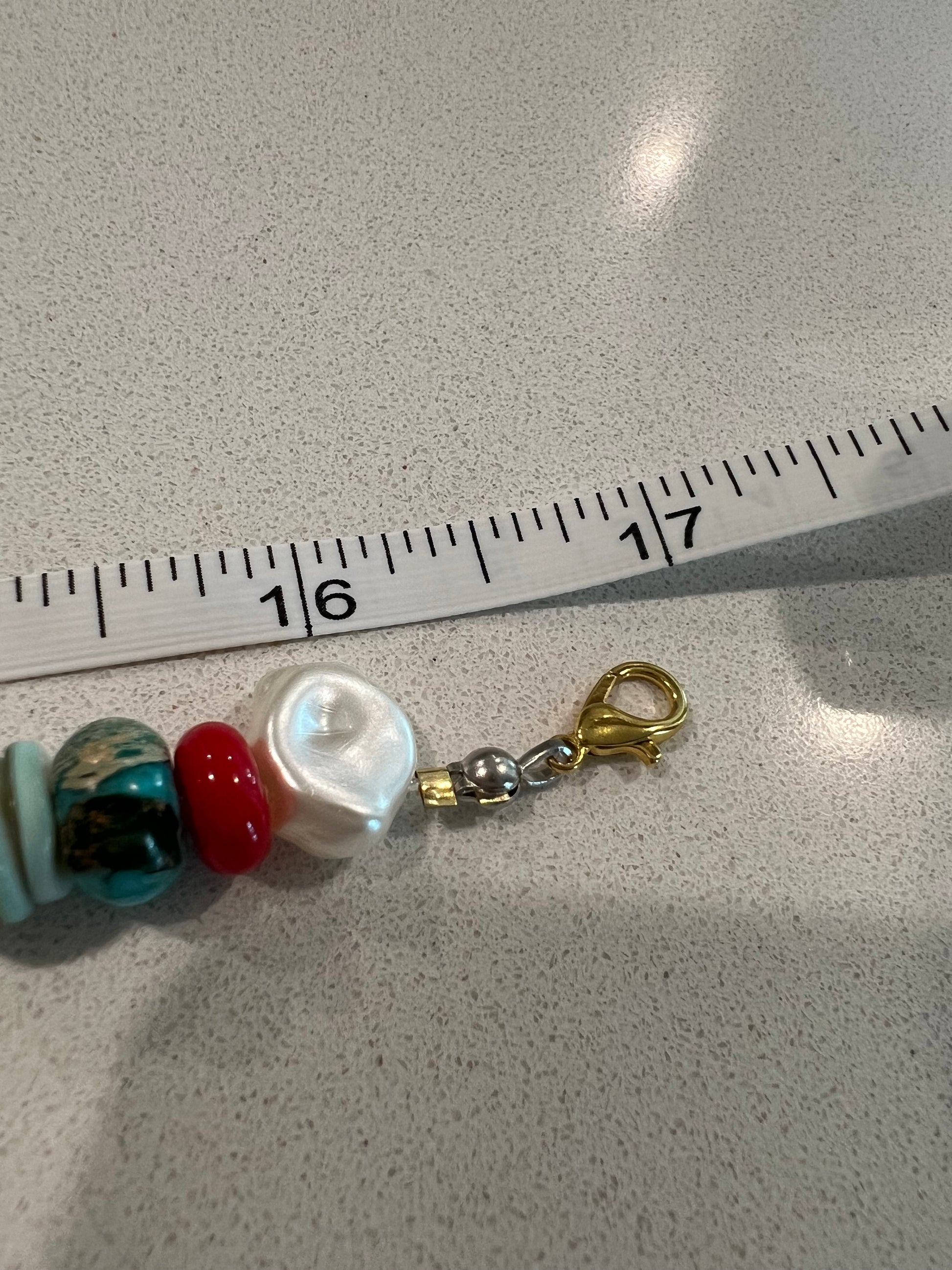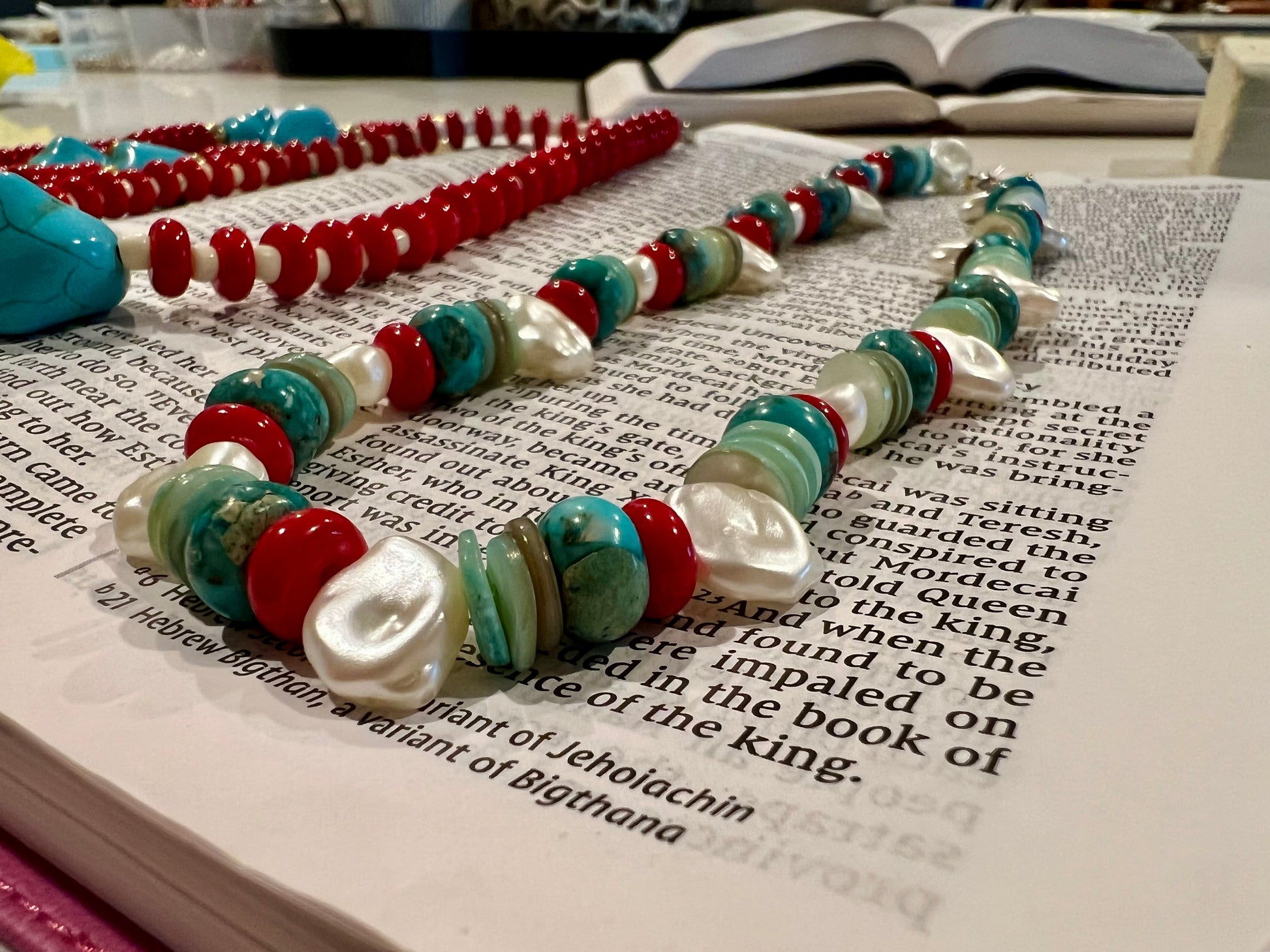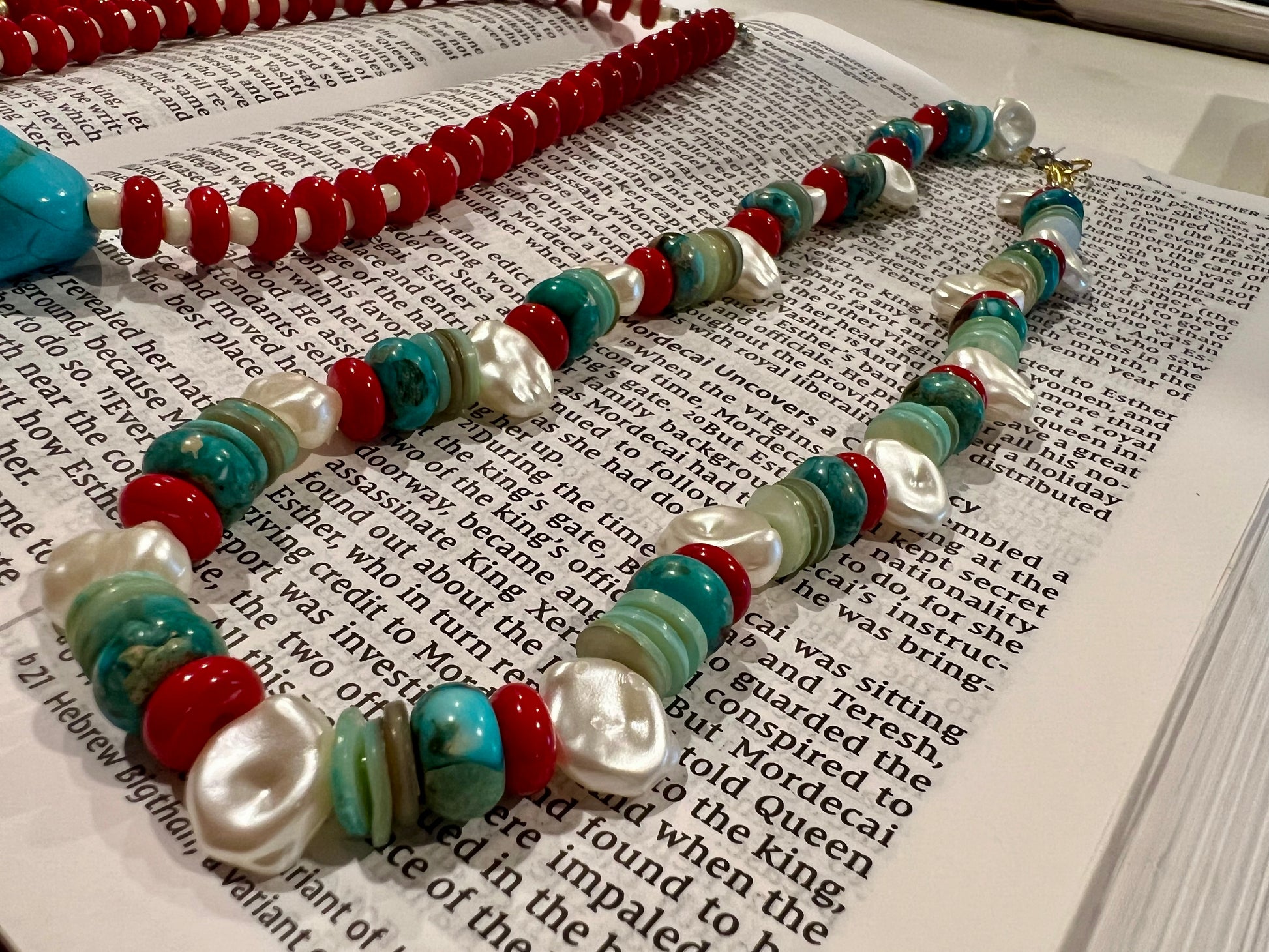 Gentle turquoise stones, pearl-like shells, and touches of red a peaceful harmony symbolizing Godās calm within the storm. Each bead whispers of His faithfulness and the serenity found in His presence.