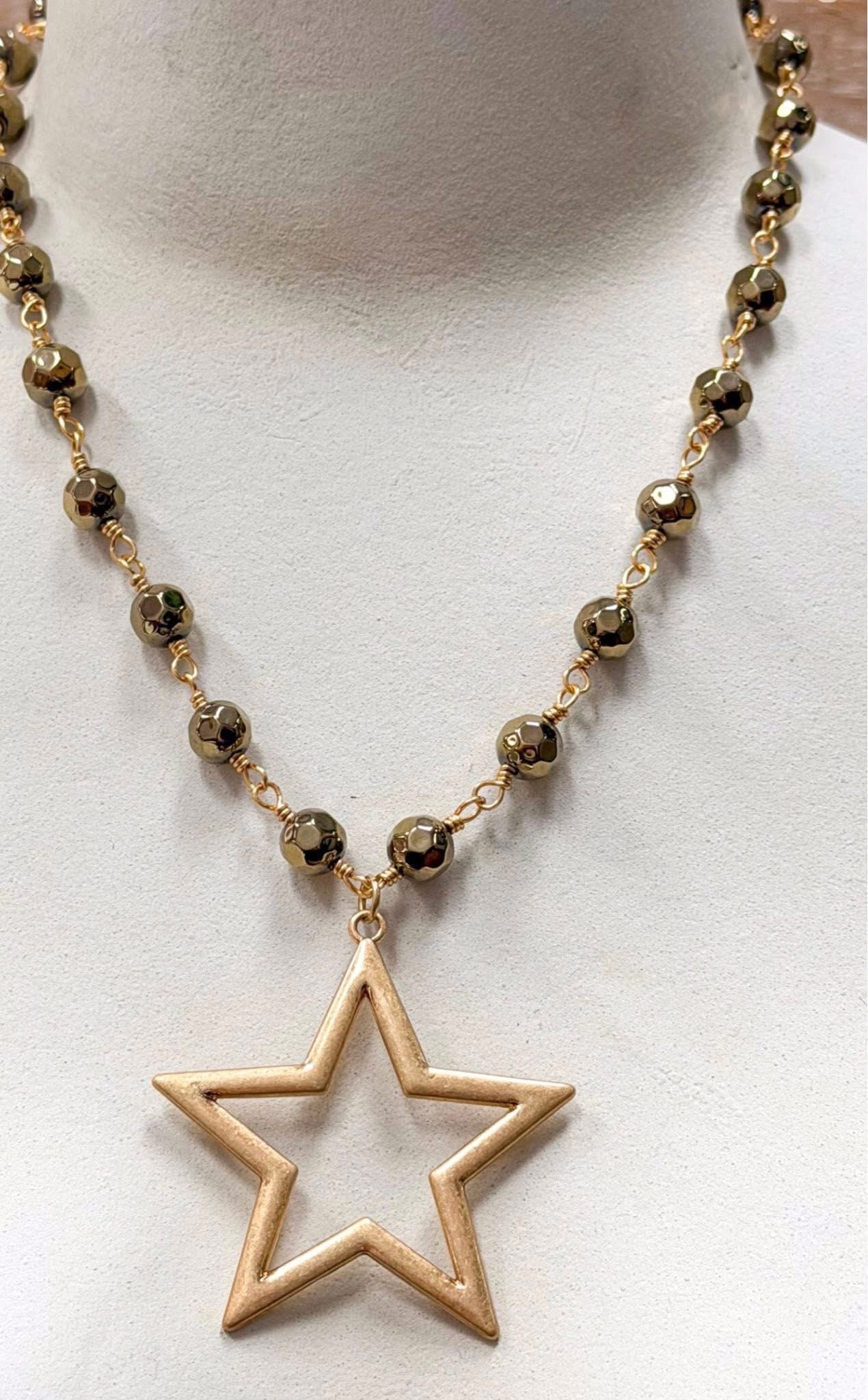 Description >> The Talus Gold Necklaces have gold faceted metallic beads with gold toned chain in between and a gold lobster claw with extender. Star or Open Star