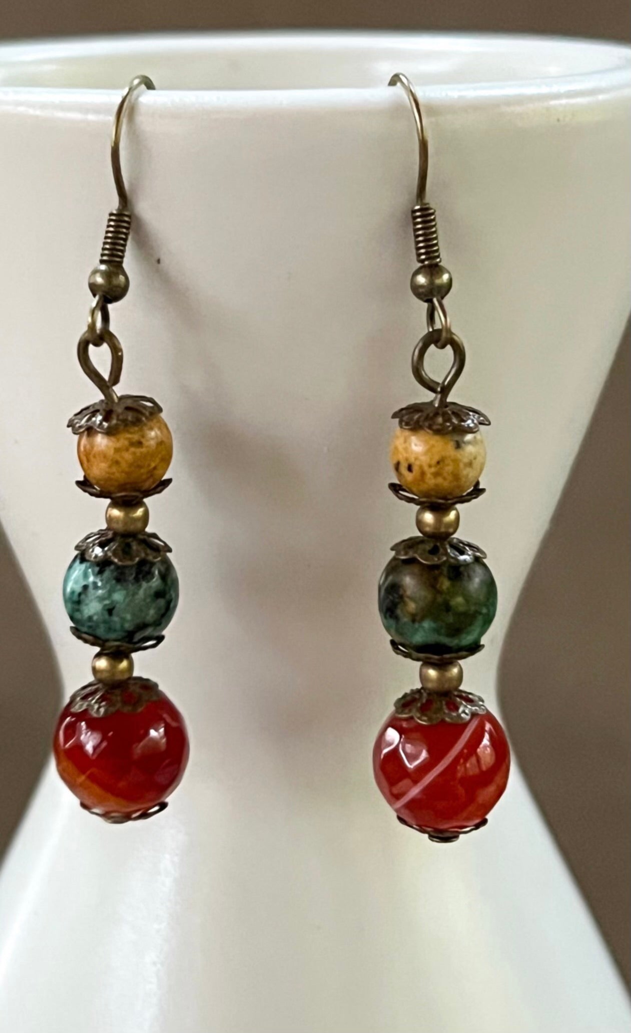Charming fishhook dangle earrings featuring three unique beads each a small reminder of God’s creativity and care.