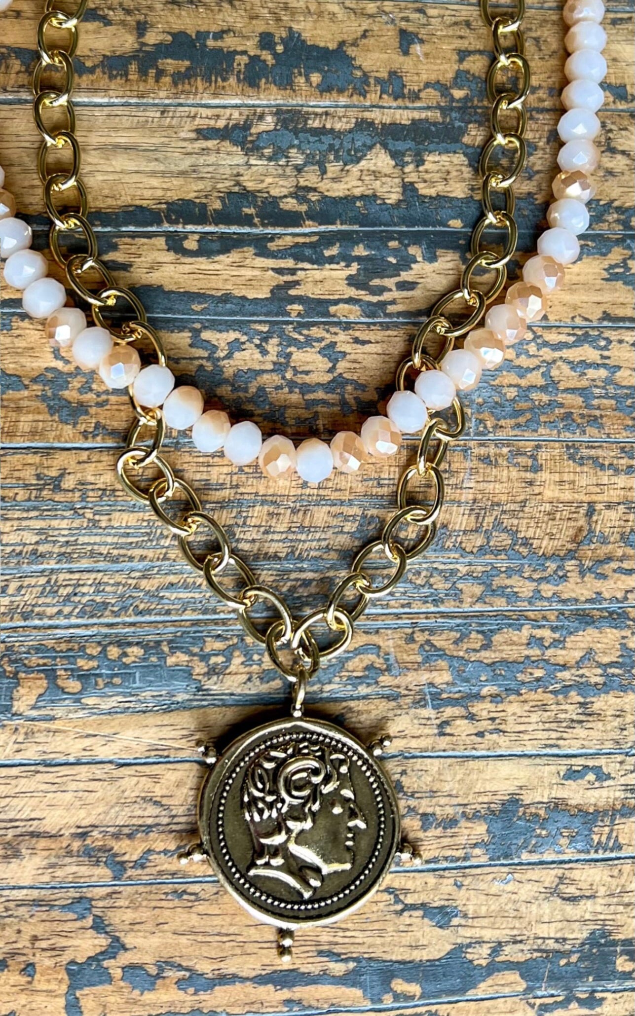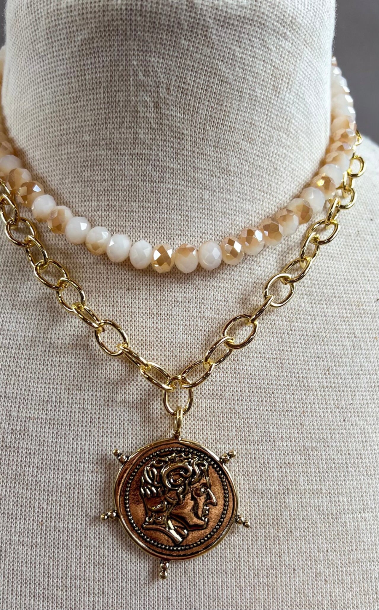 A double-layer chain necklace with a double-sided coin charm at the base. The longer layer shines in gold, while the shorter layer features soft beige and rose gold glass beads. A layered reminder of God’s abundant blessings, designed to shine from every angle.